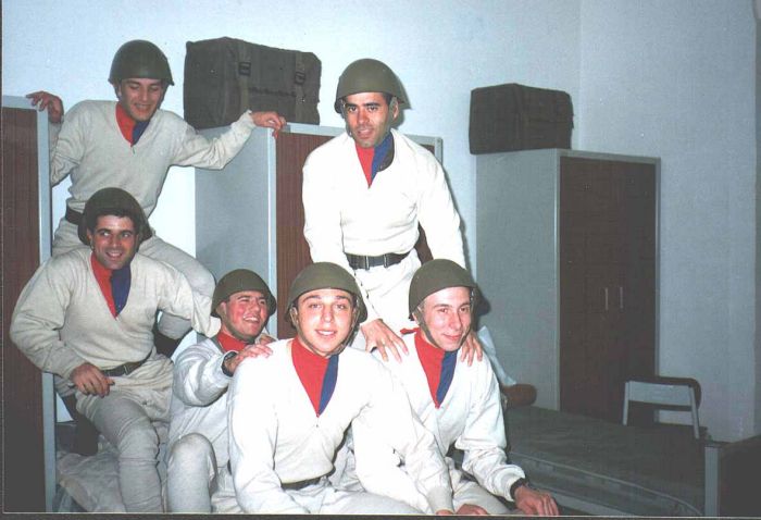 Nel frattempo erano passati quei pochi giorni con gli abiti civili, che così bene ci distinguevano, ultimo baluardo della vita che ci lasciavamo dietro malinconicamente. Anche noi, ora, non ci riconoscevamo più tanto facilmente e la cute bianca traspariva sotto il capello cortissimo. Ci scambiavamo le prime impressioni, i primi commenti: roba da disperati. Si scorgevano però anche i primi sorrisi, preludio a sane risate, che le circostanze e la tensione facevano spesso scaturire. Stava succedendo qualcosa di meraviglioso: iniziavano a formarsi dei legami stabili, di vera amicizia, un qualcosa che ci unirà per sempre stava gettando le sue fondamenta.