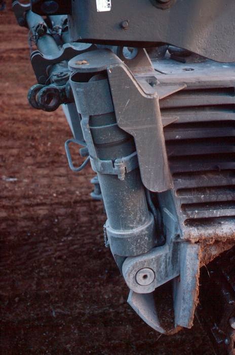 Tre immagini del supporto telescopico in posizione di riposo. In caso di utilizzo esso viene rovesciato ed allungato fino ad appoggiarsi ad una piastra in acciaio che solitamente viene trasportata sul fianco sinistro del veicolo. Si noti a sinistra del fanale la scatola circolare che contiene le connessioni per l'alimentazione idraulica del pistone (aperta nell'immagine a destra). Le corripondenti connessioni sono presenti alla base del pistone e vengono collegate tramite tubi con innesti rapidi.