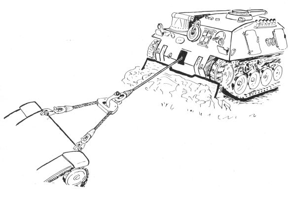 Il verricello principale con tamburo avvolgicavo ad asse verticale è fissato al centro del veicolo sotto la piattaforma di fondo del compartimento equipaggio. Il tamburo prende il moto da due motori idraulici attraverso un cambio a due velocità, una coppia conica, un riduttore di velocità e due pignoni che ingranano sulla corona dentata del tamburo. Il moto diretto ai due pignoni passa attraverso due barre di torsione aventi la funzione di distribuire regolarmente il moto e proteggere tutto il meccanismo da urti accidentali. Il cambio di velocità può essere azionato solo a verricello fermo, mediante un'opportuna scelta della marcia e del regime del motore è possibile variare la velocità di avvolgimento del cavo. Viceversa il suo svolgimento è possibile solo con il cambio in seconda marcia. In caso di sovraccarico entra in azione una valvola di sicurezza che fa defluire l'olio arrestando di conseguenza il moto del tamburo, all'alleggerimento del carico il verricello ritorna immediatamente funzionante senza alcun intervento da parte dell'equipaggio. Dopo il completo svolgimento del cavo, lungo 90 ml., restano sempre avvolte nel tamburo tre spire, onde assicurare una pronta presa alla forza di trazione. Sul tamburo è montato anche un freno a disco di sicurezza che impedisce la caduta improvvisa del carico a motore fermo con conseguenti pericolosissimi rilasci del cavo. L'uscita anteriore del cavo del verricello è protetta da un portello blindato che, al momento dell'uso, viene alzato manualmente e fatto scorrere lateralmente. Subito dietro l'apertura del cavo è presente un dispositivo a rulli tendicavo avente il compito di evitare torsioni ed aggrovigliamenti del cavo durante le operazioni di svolgimento/avvolgimento. |