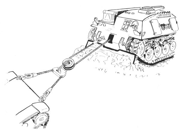 Due immagini schematiche tratte dal manuale del carro che consentono di apprezzare la disposizione dei vari componenti durante le operazioni di trazione con cavo singolo (a sinistra) e con cavo doppio. |