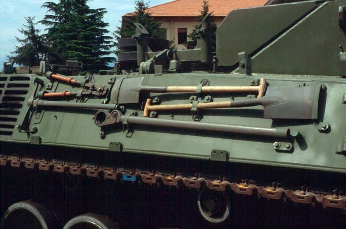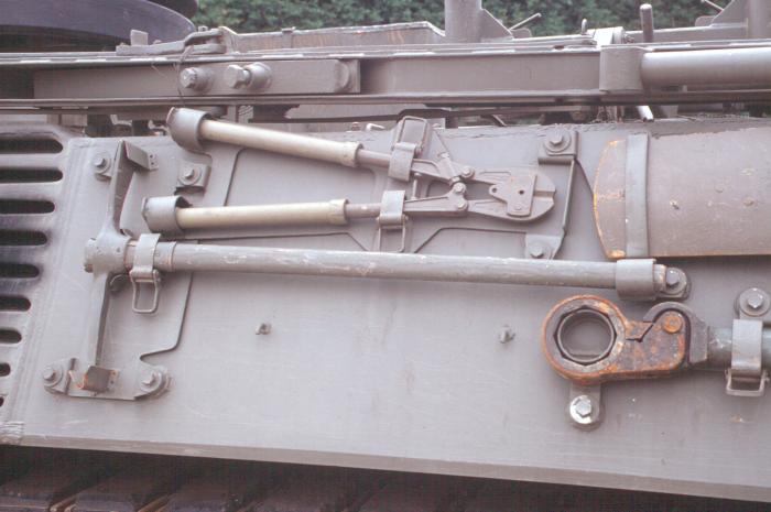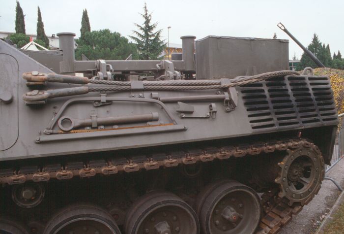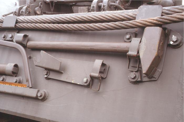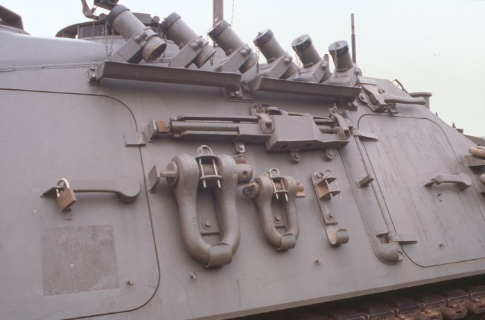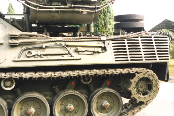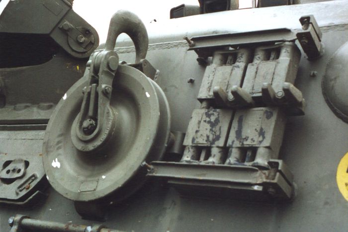 | Una carrellata di immagini illustranti il complesso delle dotazioni del carro per le operazioni di recupero. Come si nota il Bergeleopard è dotato delle più disparate attrezzature necessarie per le operazioni cui il carro è destinato. Si noti alla base della gru e spostato leggermente in avanti, la presa circolare nella quale va infilata la manovella ripresa nella foto a sinistra della seconda fila. Essa serve ad azionare manualmente il motore della gru in caso di avaria al sistema idraulico. | |||
