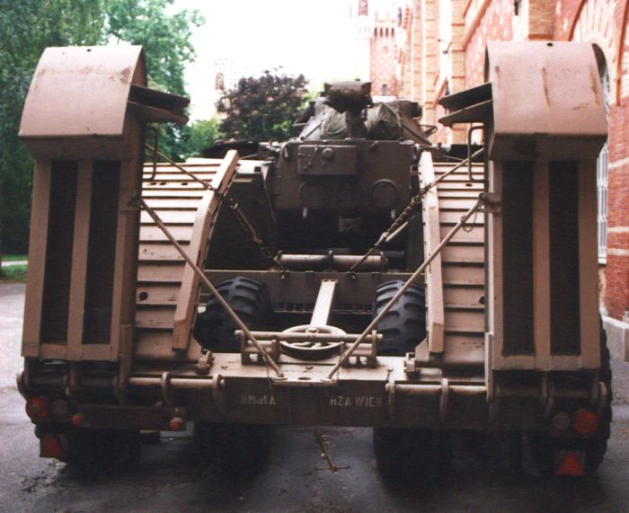Una serie di immagini delle due rampe per la salita sul semirimorchio M15A2 (qui in posizione rialzata per la marcia in modo da non interferire con l'oscillazione della sospensione posteriore) e delle quattro rampe utilizzate per evitare consentire al carro di transitare al di sopra delle ruote. Il semirimorchio M15 era inizialmente stato progettato per consentire il passaggio degli stretti cingoli dei carri dell'epoca (es. M4 Sherman) tra le ruote, ciò consentiva anche di mantenere il piano di carico particolarmente basso. Con l'introduzione di carri con cingoli larghi, primo fra tutti l'M26 Pershing, non fu più possibile adottare questo sistema. L'idea di costruire delle rampe che consentissero al carro di passare al di sopra delle ruote venne per la prima volta in mente al personale incaricato di ricevere e trasportare i primi M26 giunti nel marzo 1945 in Europa. Inizialmente di costruzione artigianale queste rampe vennero poi adottate in via definitiva. Si noti che le due rampe per la salita potevano essere spostate lateralmente in modo da adattare la loro distanza alla carreggiata del carro.
