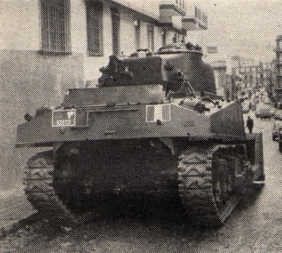 Duie immagini apparse il 7 marzo1971 su due diversi e non identificati quotidiani del sud. Le foto furono scattate durante i lunghi moti di Reggio Calabria che costrinsero le forze dell'ordine ad intervenire anche con mezzi corazzati per sedare la rivolta e sgomberare le barricate. Il carro appartiene ad un battaglione Carabinieri ed è basato su di un M4 originariamente dotato di obice da 105 mm (si riconosce il supporto del cannone montato in posizione più bassa per avanzare il punto di contatto con l'obice causa il suo maggior diametro rispetto il cannone da 75 mm e, sulla sommità della torretta, il ventilatore supplementare caratteristico di questa particolare versione del carro americano).