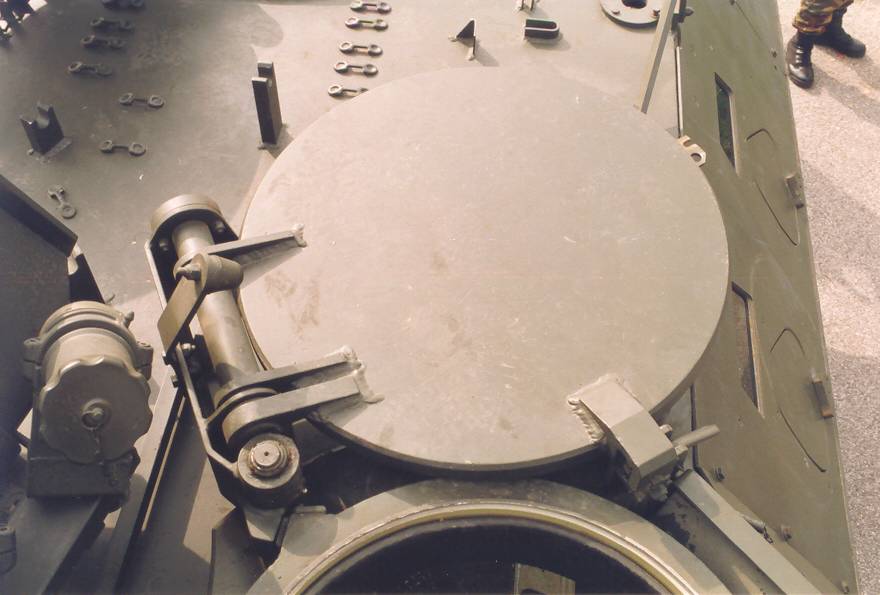 portello, apribile solamente dall'interno del veicolo. La rampa è anche dotata di una porta che consente il movimento all'equipaggio anche senza abbassare la rampa. Detta porta è dotato di una maniglia interna ed una esterna collegate fra loro. La maniglia interna della porta, montata sulla rampa nella parte posteriore del veicolo, è usata per fissare e bloccare la porta della rampa. Quando si apre la porta, il fermo con rivestimento plastico viene sollevato e ruotato verso il basso, così da permettere alla maniglia di oltrepassare e di aggirare la posizione di apertura. La porta si apre per peso proprio, ruotando sulle cerniere. La porta può essere chiusa dall'interno e dall'esterno del veicolo, ma può essere bloccata soltanto dall'interno. Essa viene chiusa tirandola e facendola ruotare sulle cerniere, quindi si ruota la maniglia in senso antiorario finché non raggiunge l'arresto. Il dispositivo di bloccaggio della maniglia interna va ruotato e posizionato in alto; il fermo viene infine fatto scorrere in basso fino a fine corsa. La rampa viene bloccata in posizione di chiusura da un comando manuale a leva posto subito dietro il posto di pilotaggio. |